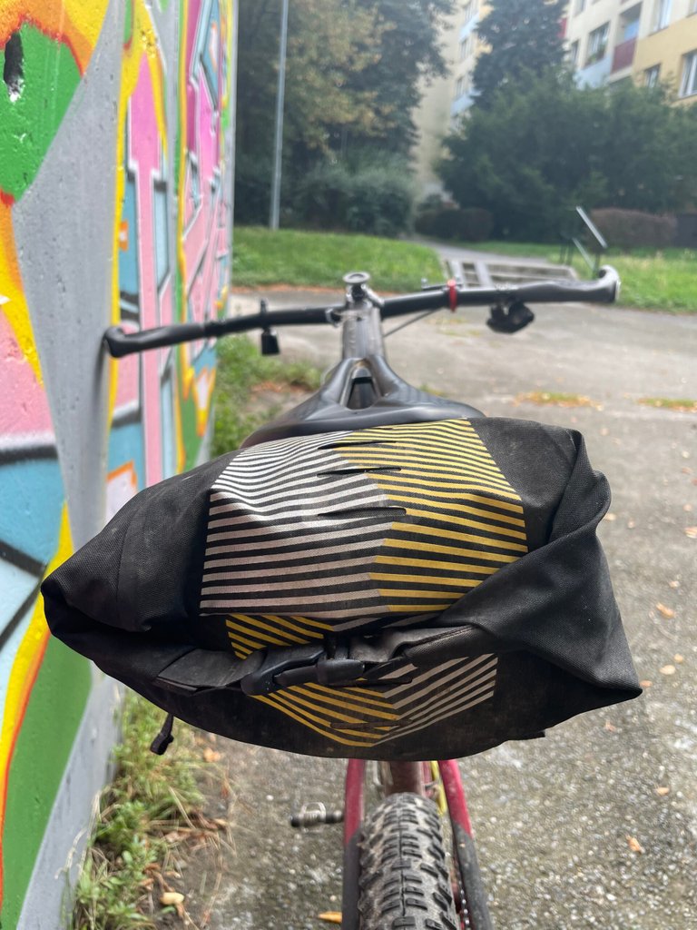 An interesting solution is the air release valve: there isn’t one. There is a special design, that protects against water ingress from the direction of the rider, but elsewhere it’s just regular fabric without waterproof properties. There’s no risk of forgetting to close the valve. On the other hand, the bag won’t survive being submerged in a river. During regular rides, I haven’t had water enter the bag.