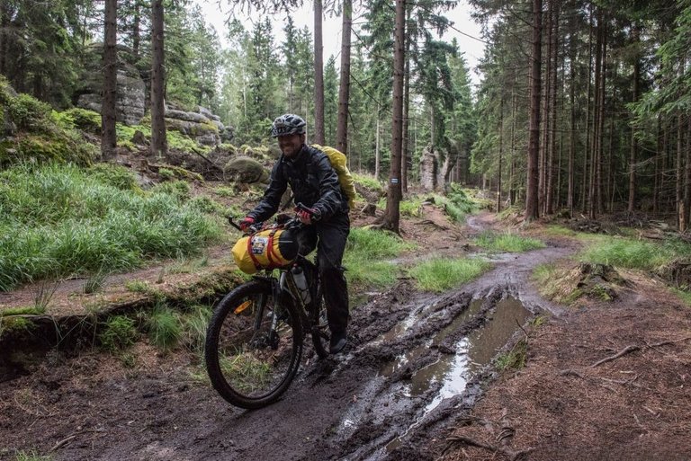 Škoda, že jsem si ty Orlické hory moc neužil. Všude byla mlha a nikde jsem se nemohl zastavit. Počasí ale poručit nejde. Úplně nahoře na kopci se cesta změnila v potůček. Projel jsem ho suchou nohou, ale jinak jsem byl stejně celý mokrý. Dojel mě tam Indián (49), který se vody rozhodně nebál a potokem projel sebevědomě.