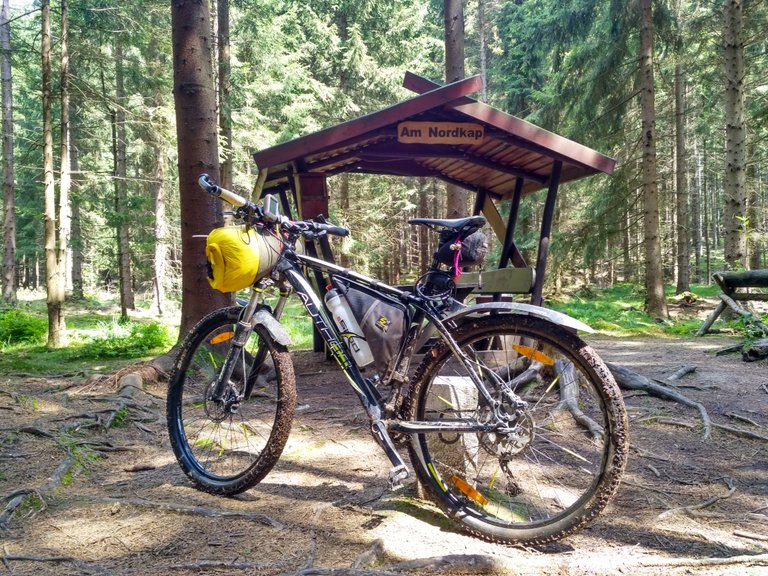 Pořád jsem si říkal, že to není tak strašné. Pak jsem viděl ceduli Nordcap, 1,5km. No, to už bylo docela blízko. Ale teprve v tom momentě to začalo. Problém už nebyl jenom v mohutných kořenech, které vyrůstaly snad i tam, kde nebyly stromy. Cesta totiž vedla podél potoka, přes který se muselo kolo přenášet. A ne jednou, ne dvakrát, ale pořád. Vždycky podle aktuální situace na pěšině. Později jsem o této cestě četl v nějakém průvodci, že je bezproblémová a velmi romantická.