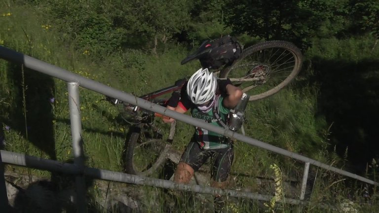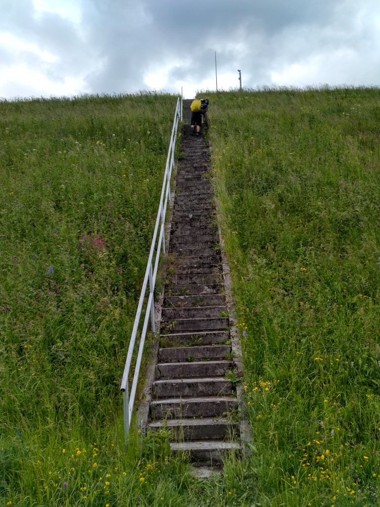 Až skoro k ní se jede po široké cestě a pak přijde odbočka. Když jsem k ní dorazil, zeptal se mě jeden závodník, jestli je to opravdu ono. Přikývl jsem a začali jsme tlačit. Nejdřív po svahu, pak přes kamenné koryto a nakonec tři řady schodů. Nejlepší je vzít kolo do ruky a vyběhnout to. Koho že napadlo tomu říkat cesta? Nahoře byl ovšem úžasný výhled, počasí nám přálo.