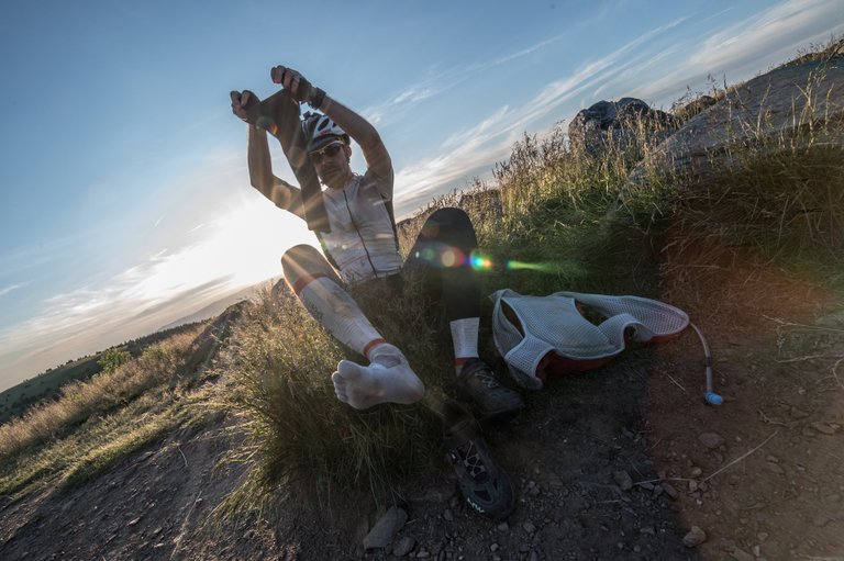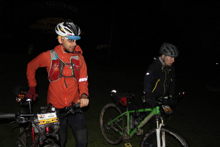 Asi 500 metrů před checkpointem jsme projížděli vysokou trávou. Nevím, jak se mi to podařilo, ale zapletla se mi do kazety i přehazovačky a přišel jsem o pohon. Chvilku jsem se to pokoušel opravit, ale asi nemělo cenu se s tím dělat ve tmě, když jsme tak blízko. Poslední kousek jsem už dojel jako koloběžka. Jelikož to bylo už jen z kopce, vlastně to ani nešlo poznat.