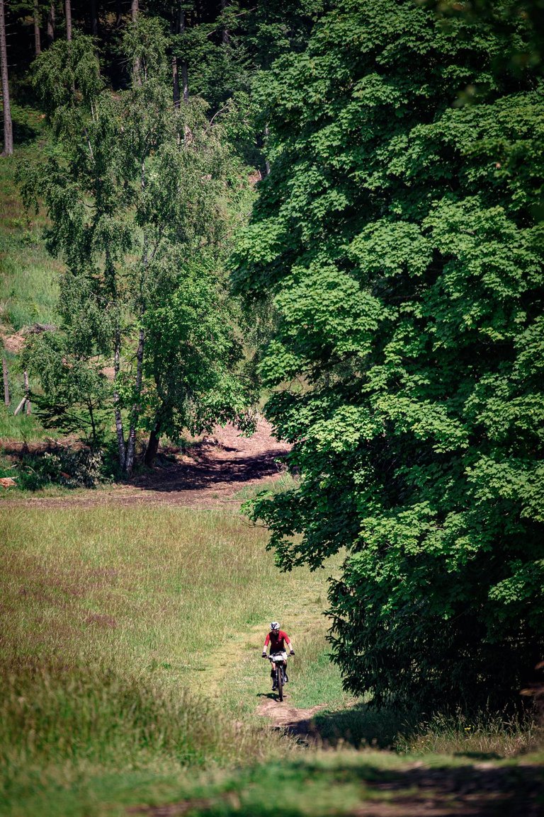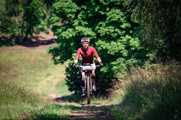 Sjezd byl samozřejmě výživný. Větve, šutry, …no však to znáte. Jak jsem se přibližoval dolů, uvědomil jsem si, že to stíhám do čtyř dnů. Proto jsem to začal pálit. Profrčel jsem kolem jedné skupiny fotografů a při jízdě dolů zapomínal, že mám brzdy. Možná jsem to měl takhle drtit celý závod. Minimálně dolů.