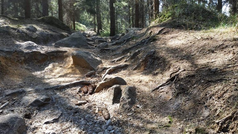 - Poslední sekcí byla lesní, kamenitá cesta a jak se blížila k vrcholu, stávala se strmější a strmější. Neměl jsem dostatečně nízké převody, takže to muselo jít pěkně silou.