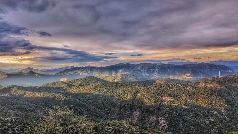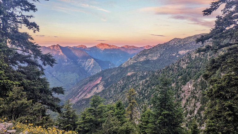 Ospalost mě netrápila, i když byl můj postup vcelku pomalý a nudný. V té tmě mi černočerný les moc krás neukazoval. To se změnilo, když jsem nekonečnými serpentinami stoupal na sedlo Kaliakoudas. Zrovna když se slunce dralo na svět a dotvářelo sytě barevnou podívanou, dosáhl jsem vrcholu. To byly výhledy! Cítil jsem, že všechna ta námaha, kterou jsem do stoupání po štěrkové cestě dával, nevyšla vniveč.