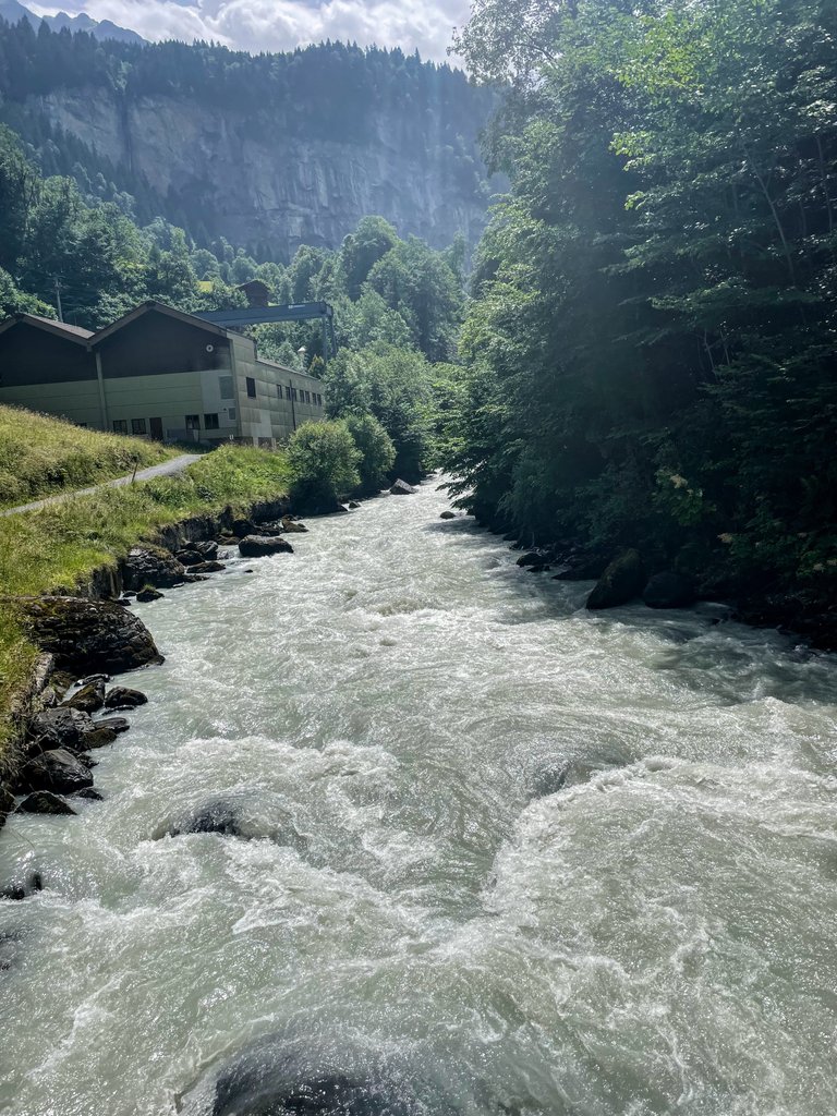 Ve Wengenu jsem se zastavil asi 10 minut, abych si odpočinul. Pořádně se mezitím rozpršelo. Moc se mi tam nelíbilo, protože ve město bylo znovu příliš velké množství turistů. Když jsem ale pokračoval podél řeky Lütschine, zamiloval jsem si to tam. Měla krásnou modrou barvu a chladila! Předpokládám, že to byla ledovcová voda.
