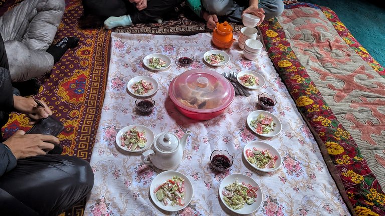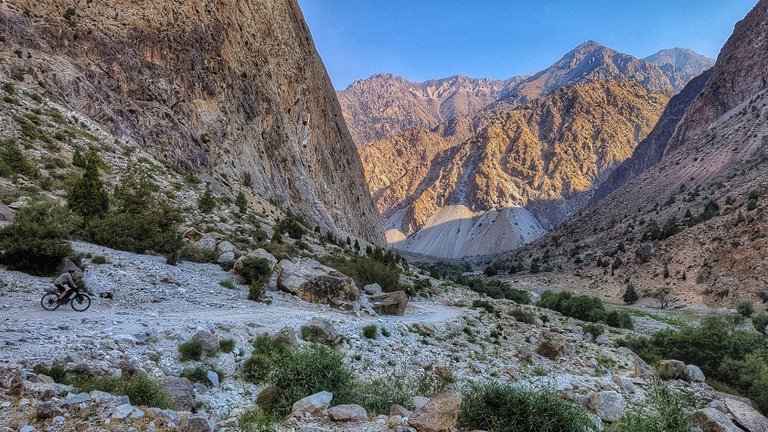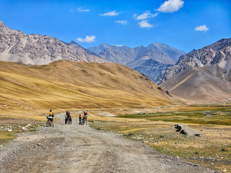 Po Pamírské dálnici jsme se pomalu vraceli zpátky do hor. V půlce jsme se vyspali, na hodně pichlavých kytkách, ale karimatka to vydržela a pokračovali další den. Ve vesnici jsme potkali Hannese, kterému už přišlo kolo. Obecně bylo velmi snadné narazit na další účastníky Silk Road Mountain Race.