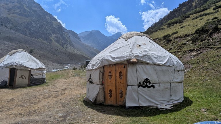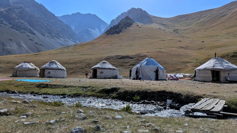 Další spaní jsme si vyhlédli v jurt kempu v nadmořské výšce 3000 metrů nad mořem. Byl to pořád ještě pozvolný výstup? Výška se už na mě začala projevovat, i když jsem si nebyl jistý, jestli to není jen vedrem. Stín by tu člověk jen těžko pohledal a slunce pražilo silně. Cesta se naštěstí vinula vedle potoka, takže nebyl problém se osvěžit.