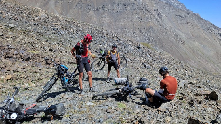 Tomáš Hadámek se toho nebál a vylezl na téměř kolmou, sypkou stěnu. Ale tam se mi ani za boha nechtělo. Pak naštěstí Tomáš Fabián objevil velmi úzkou stezičku, přes sypkou stěnu, kde se jakž-takž dalo projít. Pak už jen stačilo přenést kolo přes další části laviny, která byla z větších kamenů, takže se tolik nesypala. Nahoru na Jiptick pass jsme se dostali asi po pěti hodinách. Na 10 kilometrech jsme nastoupali 1300 výškových metrů. Z výšky jsme krásně viděli, že druhá pěšinka byla mnohem příjemnější.