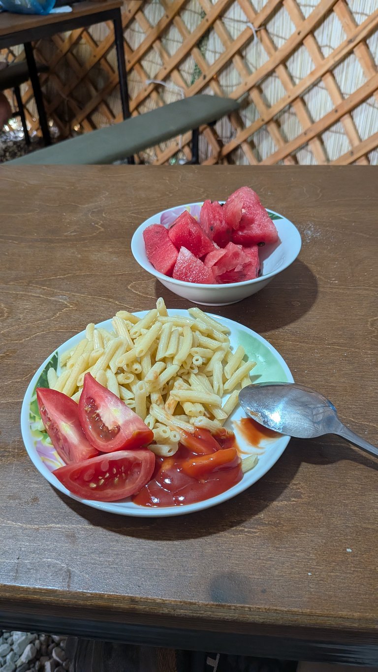 Dostal jsem i jídlo - v přepočtu za 200 korun. Šlo o těstoviny s kečupem, jedním rajčetem a miskou melounu. Později mi Tomáš Fabián vyprávěl, že dostali něco mnohem lepšího, ale na nás tam vzadu zbyly jenom zbytky. Víc jsme si asi nezasloužili.