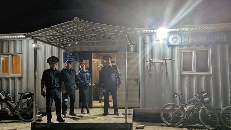 Spát jsem chtěl za úplně poslední vesnicí. Doufal jsem, že v noci bude otevřený nějaký obchod. V Kyrgyzstánu to žije spíš večer než ráno. Když jsem viděl světlo a shluk závodníků okolo, myslel jsem, že mám vyhráno. Ukázalo se, že to je policejní stanice a ochránci pořádku nás pozvali dovnitř, že se tam můžeme vyspat. Neodolal jsem.
