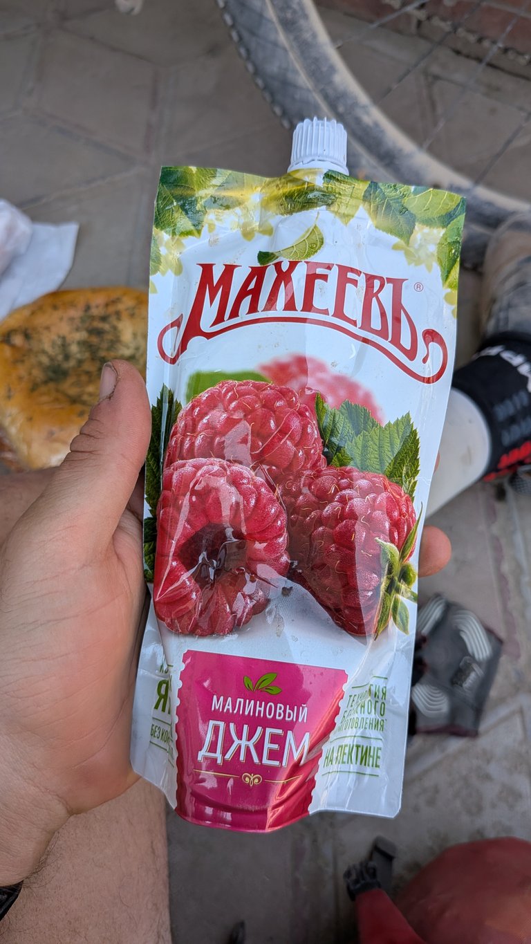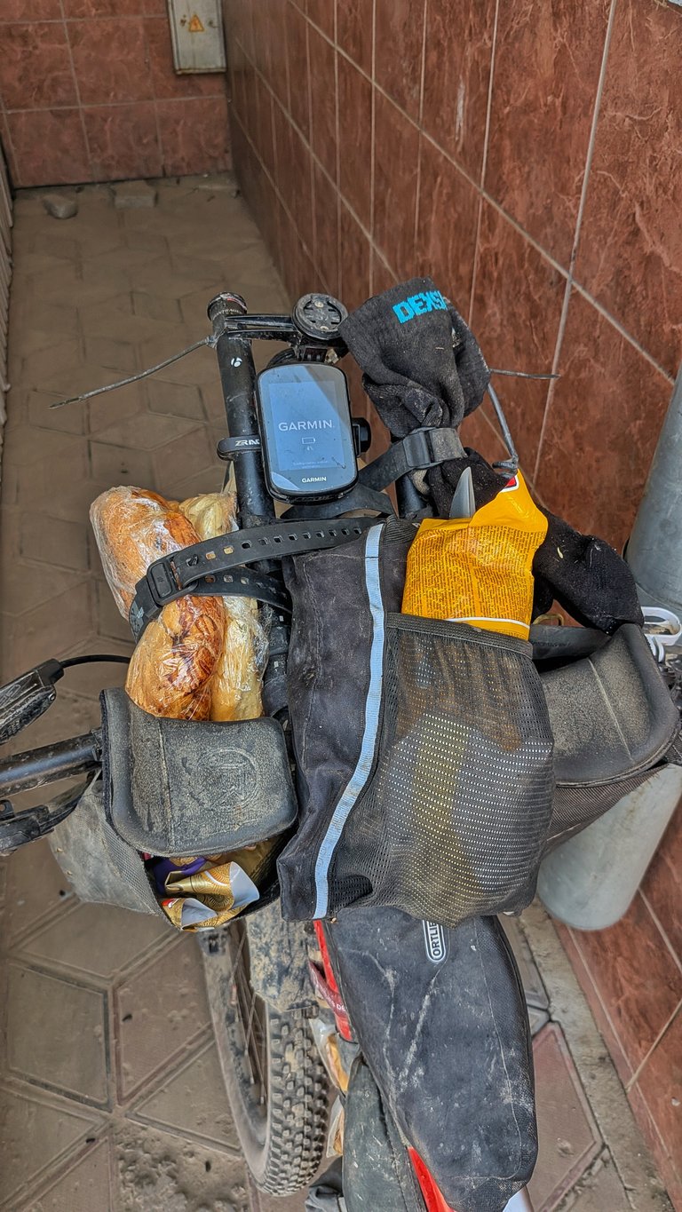Pak jsem se stavil v místním Globusu, kde jsem nakoupil maximum, co se mi mohlo na kolo vejít. Měl jsem plné i všechny kapsy. Koupil jsem dva chleby. Jeden jsem si přes pásek upevnil na hrazdu. Dva obrovské sáčky marmelády. Víc jídla jsem si vzít nedokázal a jedno balení slunečnicových semínek jsem musel nechat na schodech. Snad si ho někdo vezme.