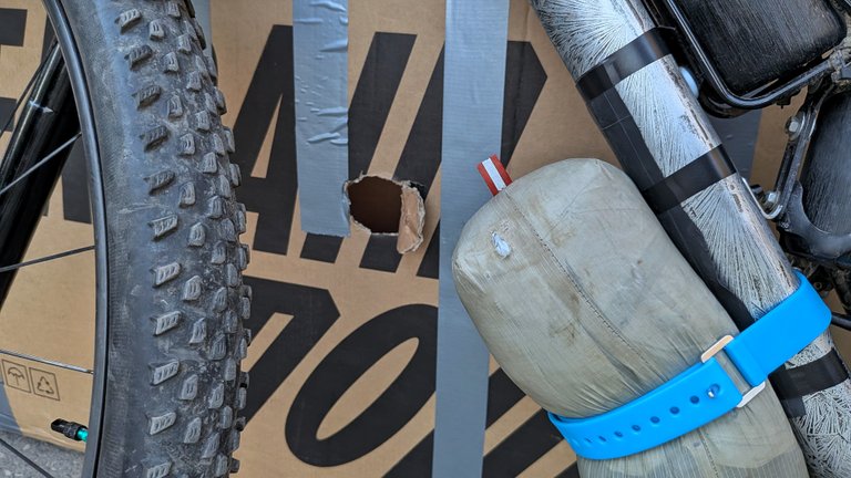 Nebylo to ale tak snadné. Smolařem dne se stal Tomáš Hadámek, kterému sice kolo přišlo, ale nebylo tak úplně celé. Při přepravě se mu vytvořila kruhová díra, kterou vypadl spacer na přední osu. Malý kousek kovu, ale tak důležitý … a blbě sehnatelný. Naděje ale umírá poslední a tak se vydal na žluté, elektrické koloběžce nalézt nenalezitelné po Ošských silnicích, kde asfakt bylo často cizí slovo.
