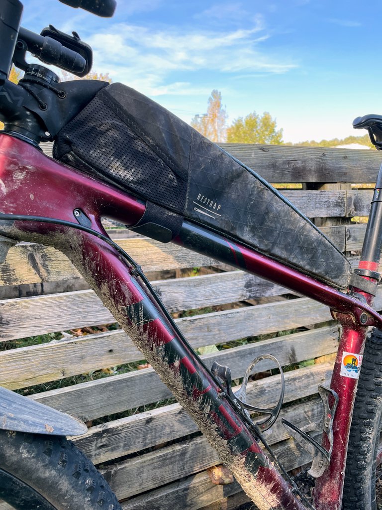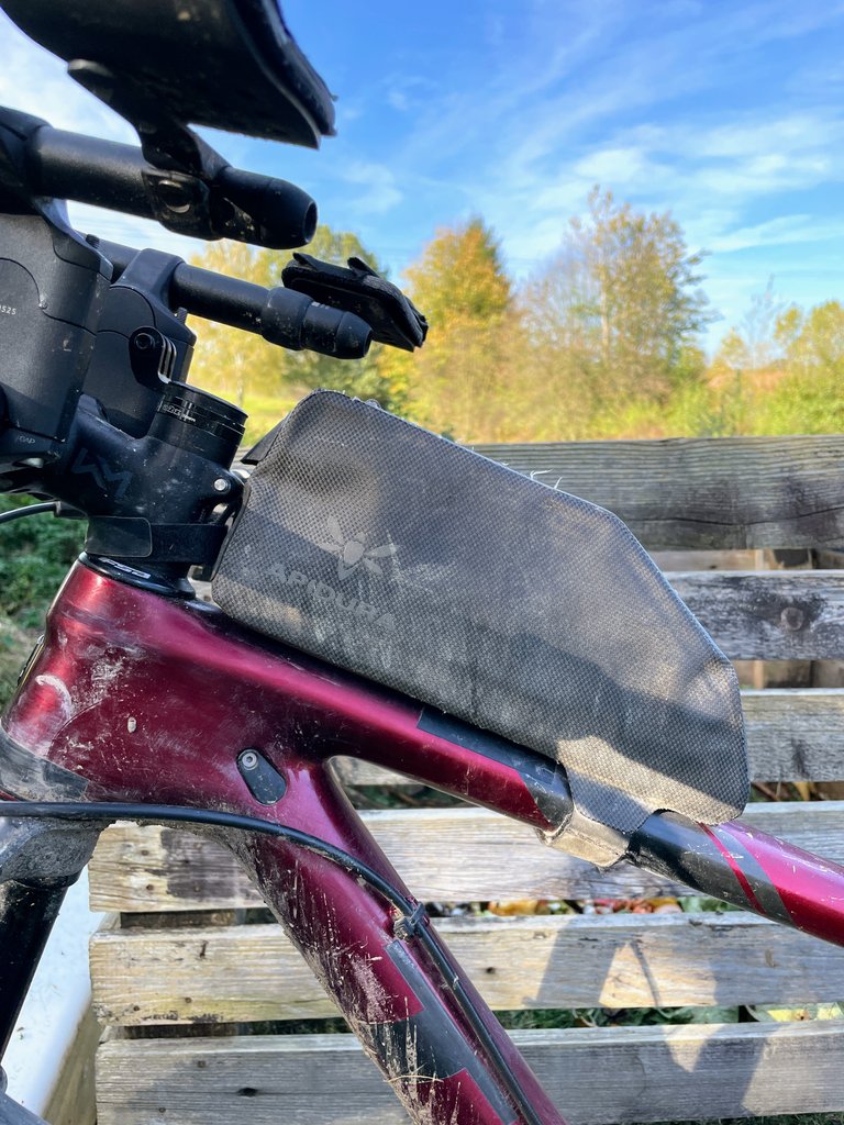 The “Top Tube Bag”. For a long time, these were small—around one liter. Some gravel and road bikes have bolt mounts for them. Later, long variants appeared that fill the space almost to the seat tube.