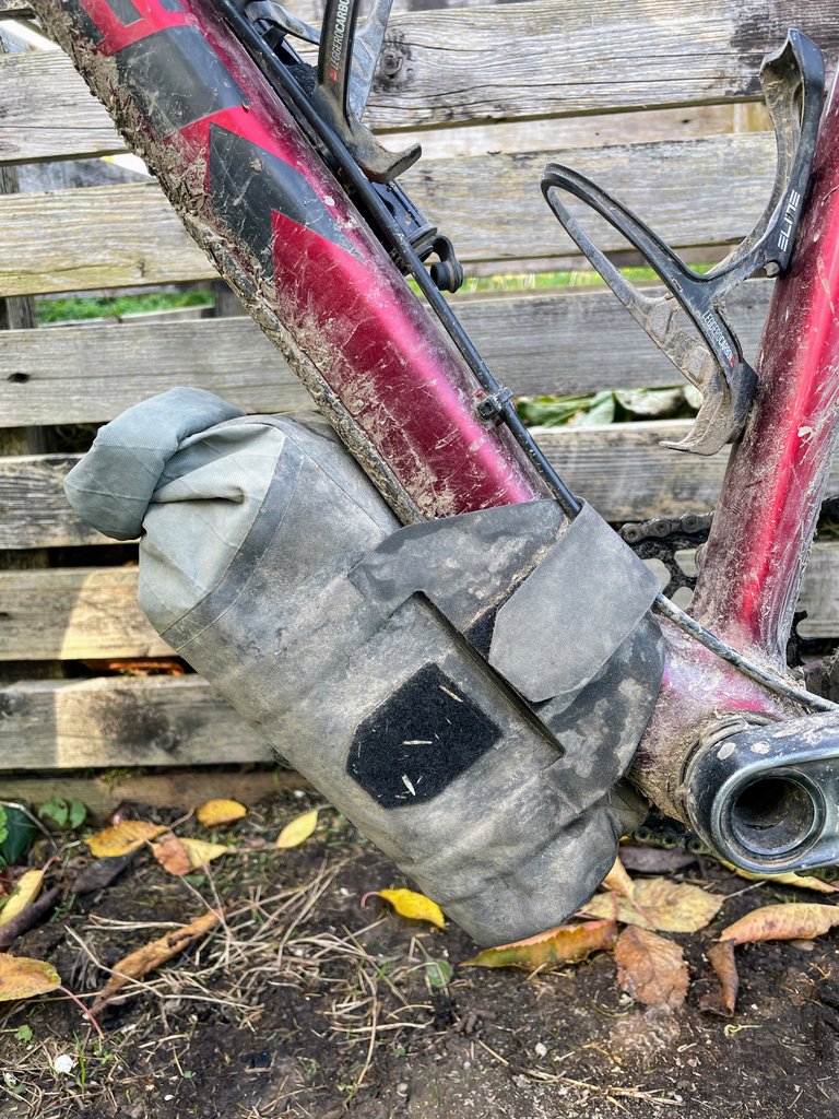 The main downside is that it’s exposed to tons of mud if you ride off‑road in all weather. If the bag is waterproof, the contents are protected, of course—but getting into such a filthy bag is not a pleasant experience.