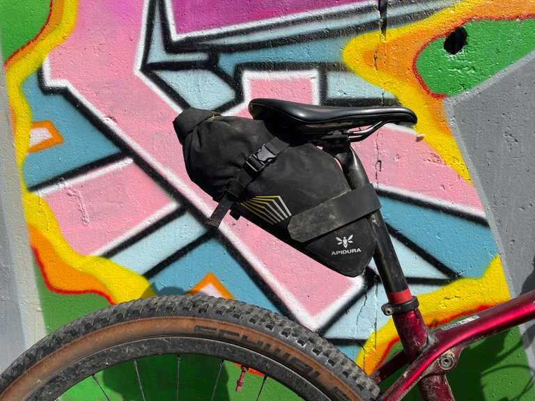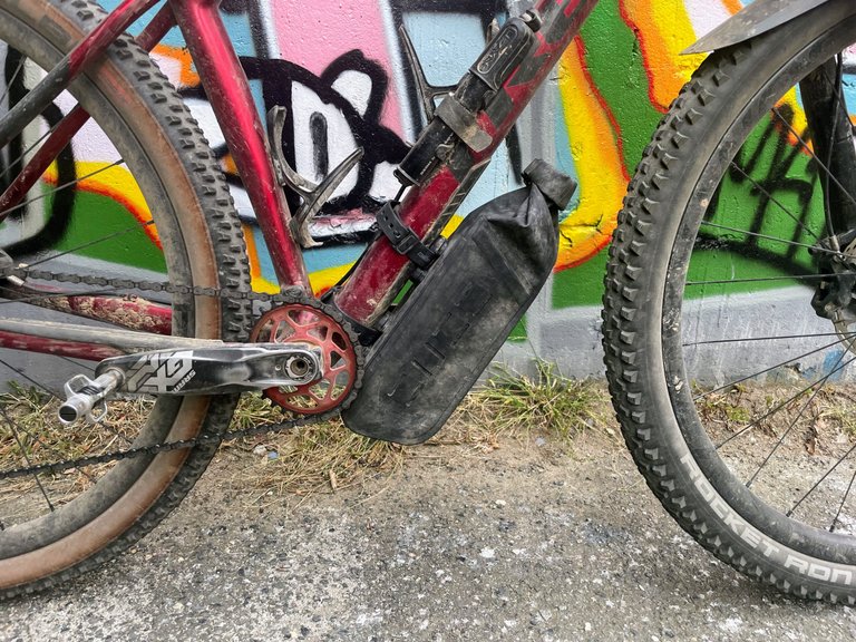 If there’s space for a bag, let’s use it. The “Downtube bag”. Ideal for heavy items you don’t need to access often. Under the frame, the bag doesn’t get in the way and doesn’t affect handling.