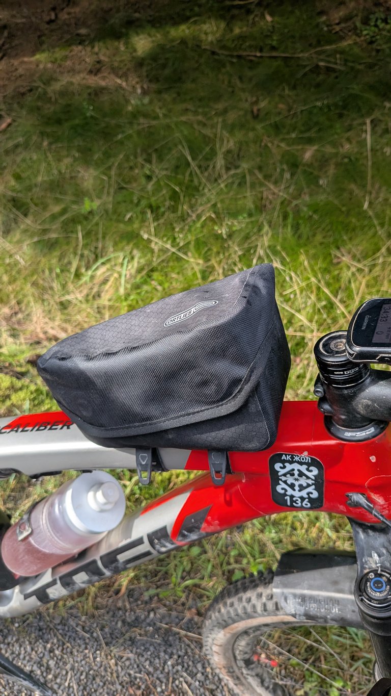 The Fuel-Pack top tube bag from Ortlieb weighs 160 grams (my scale shows only 154 g and ~120 g without the rubber straps) and offers a oneālitre capacity. The closure is magnetic and can easily be operated oneāhanded. You attach it either with mounting bolts or two rubber straps that keep the bag locked in place. At the widest point it measures 21 cm, at the narrowest about 6ā7, and my knees never touch it. Inside there is a single mesh pocket for easier organisation.