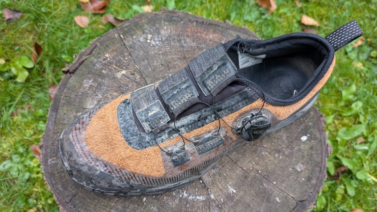 They close with a single BOA dial. I used to say I wouldn’t want shoes with just one dial anymore, but here it wasn’t a big issue. Only putting them on isn’t pleasant. In “regular” shoes I can open them wide and slide my foot in easily. Here I have to help with my fingers to get them on. And when your fingers are totally cracked, it’s unpleasant. A shoehorn would help.