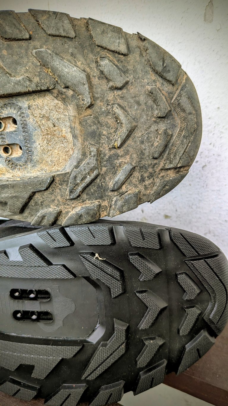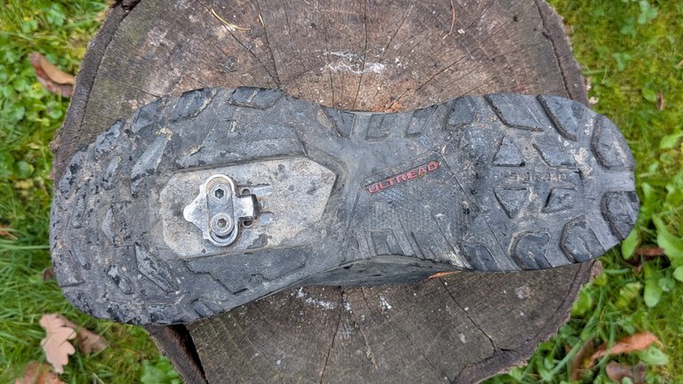 In terms of durability—there are about two spots where the shoes started to come slightly unglued; nothing urgent so far. One seam gave a little—I probably rubbed it against the crank. The outsole is quite worn and the lugs are about halfway, in places down to a third. But, as I said, conditions were extreme. One thing I find interesting: the plate where the cleats bolt in is removable, which improves the shoes’ repairability.