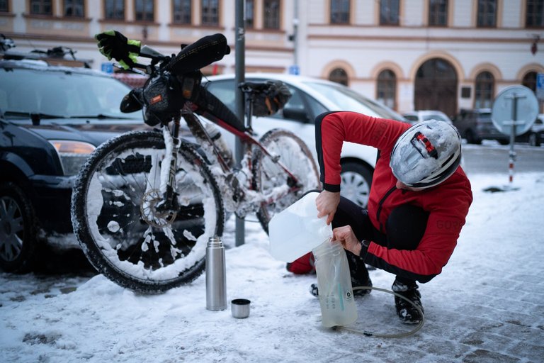 I had a really low moment when I had a problem with my brakes and I needed to remove my rear wheel. As I didn’t have the anti-freeze, I used my breath to warm the axle so I could unscrew it. And trust me, you don’t want to do any of that with your bike in these temperatures. Your body will lose heat very fast, and your fingers will soon feel like wooden sticks. Even in my down jacket, I had a hard time keeping warm and repairing my bike. It can be risky.